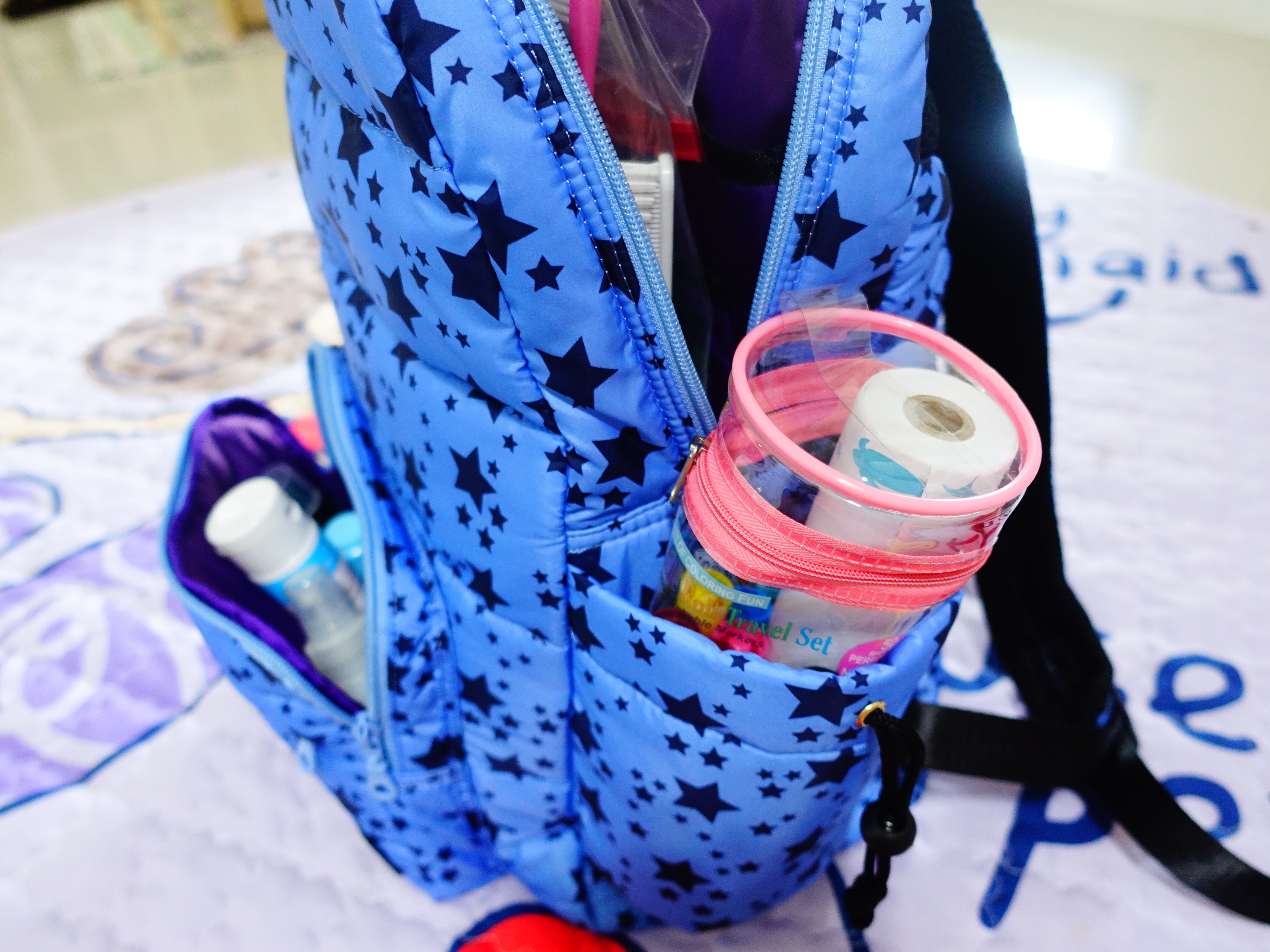 經我這壞婆婆內外粗略打量後,就要來實際考驗這新嫁娘,是否能讓通過我們家「沈重的負擔」了!下面就是平常外出旅行或出國,我們一日會準備的主要行頭。出門在外,包包內我一定會準備一整套鰻魚換洗的服裝(包含上下衣、薄外套和內褲),還有必備防曬、清潔劑或隨身酒精、防蚊液、止癢劑、乾濕紙巾、水壺、外出餐具組、鰻魚外出打發畫畫用品、繪本1-2本、簡單髮飾和梳子,最後就是少得可憐的鰻媽小咪咪私密小物(就是那個毛怪小收納袋)。