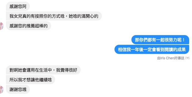 我們一開始與孩子講話時,只會專注於跟他們對話互動,什麼時候對他們解說過母語中的字詞意思與語法呢?對於周遭不斷提出的「只跟著唸,真的不必解釋嗎?」、「爸媽英文不好可以陪讀嗎?」、「孩子究竟聽不聽得懂呢?」等滿滿的疑問聲,我們都藉由Maya這兩年來的學習,得到了最直接和實際的見證,從跟著讀,到自然而然認識多數常見字,再到現在起碼可以自己唸一本新書的70%,甚至理解文章的內容。