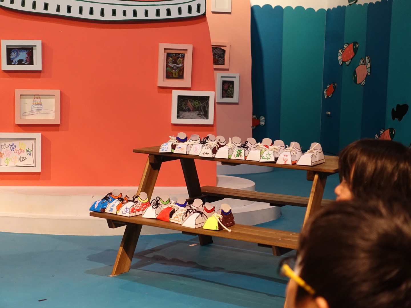 在妙妙小鎮的《老鞋匠與精靈》故事中,將手作融入戲劇中,是另一個難忘的體驗。意想不到<玩劇島>的創作團隊們會這樣巧妙的編排,一入島就發放的「玩劇包」原來別有用心。孩子們不僅要幫助可憐的老鞋匠製鞋外,還要拿著預先準備好的金幣,完成跟老鞋匠買鞋的任務。(從著色,組裝鞋子,綁鞋帶,排隊買鞋,孩子完全參與戲劇中)