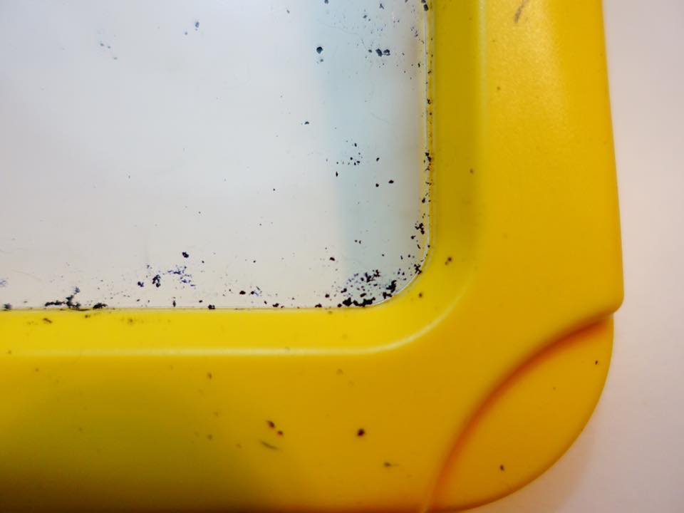 這實在是一組立意良好的教具,可惜的是,巧連智的描繪板相對陽春,打燈效果不甚理想,我都好怕Maya用眼過於吃力;另外,使用白板筆在壓克力上描繪,擦拭後都是小屑屑且難以清理乾淨,也是我相當困擾的問題之一(如下圖)。但也因為「閃亮亮描繪組」激發我的靈感,賦予「小小漫畫家」更多元的延伸應用(拉到最後一趴看鰻媽如何讓它化身成為多用途學習武器)