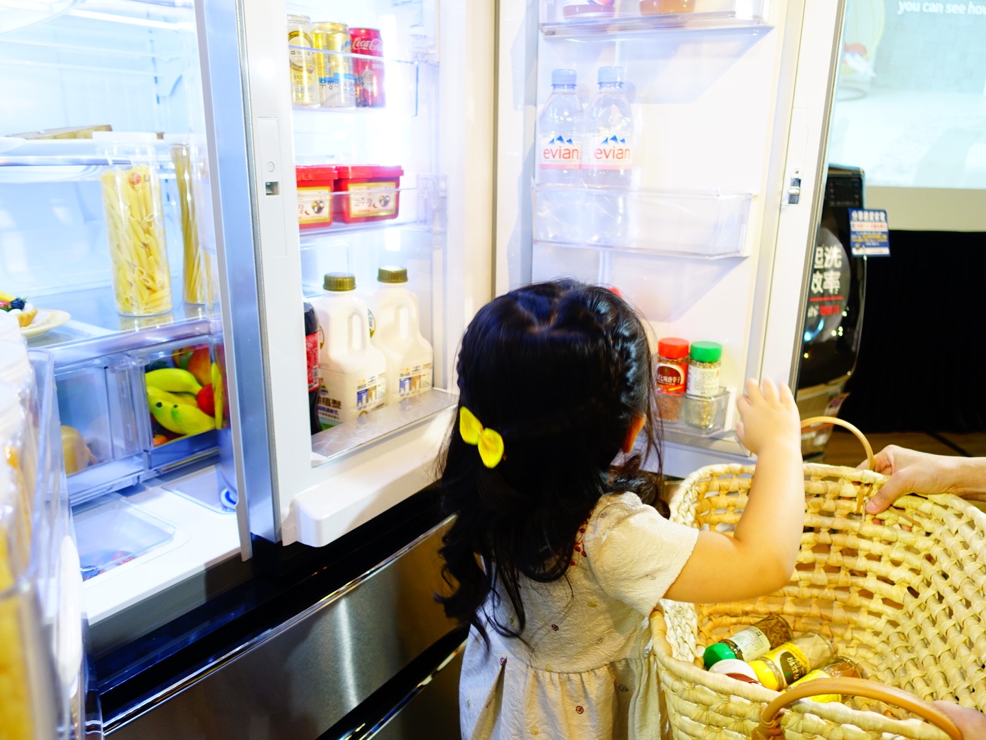 媒體特別請鰻魚示範門中門魔術冰箱,針對兒童設計的「好開」一指設計。