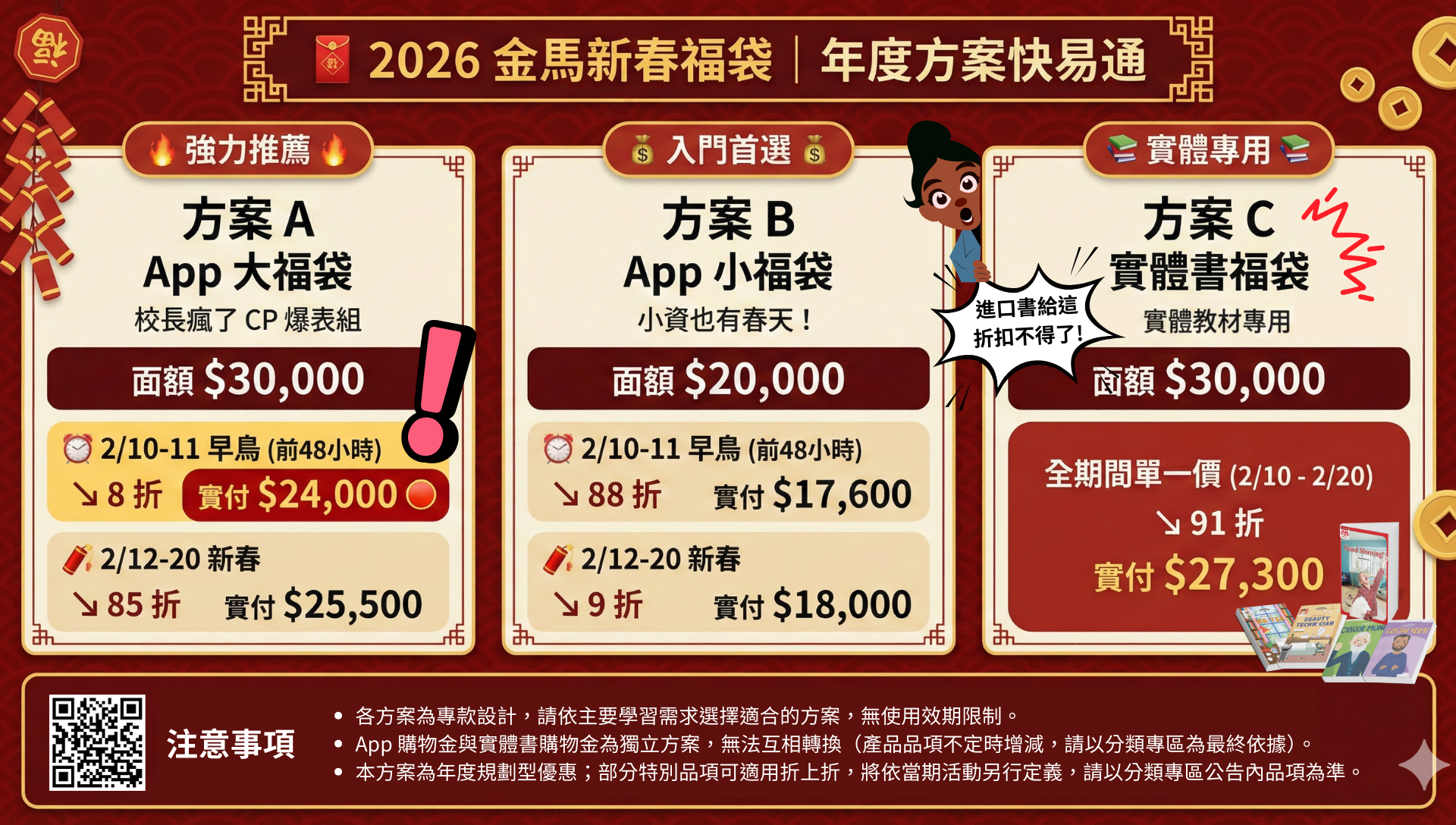 所以,2026 金馬年,我們首次規劃「儲值方案」邀請爸媽趁著不可多得的折扣,先將年度學習預算「圈起來」,把「 本來就會用到的一整年學習支出」一次搞定。未來 12 個月, 妳在我們的學習生態系裡取用的任何學習資源,都不用再煩惱費用。 因為妳早就做好了準備, 剩下的,就只需要專注在最重要的事情上— 在這個安定的家裡,專注陪伴孩子學習。