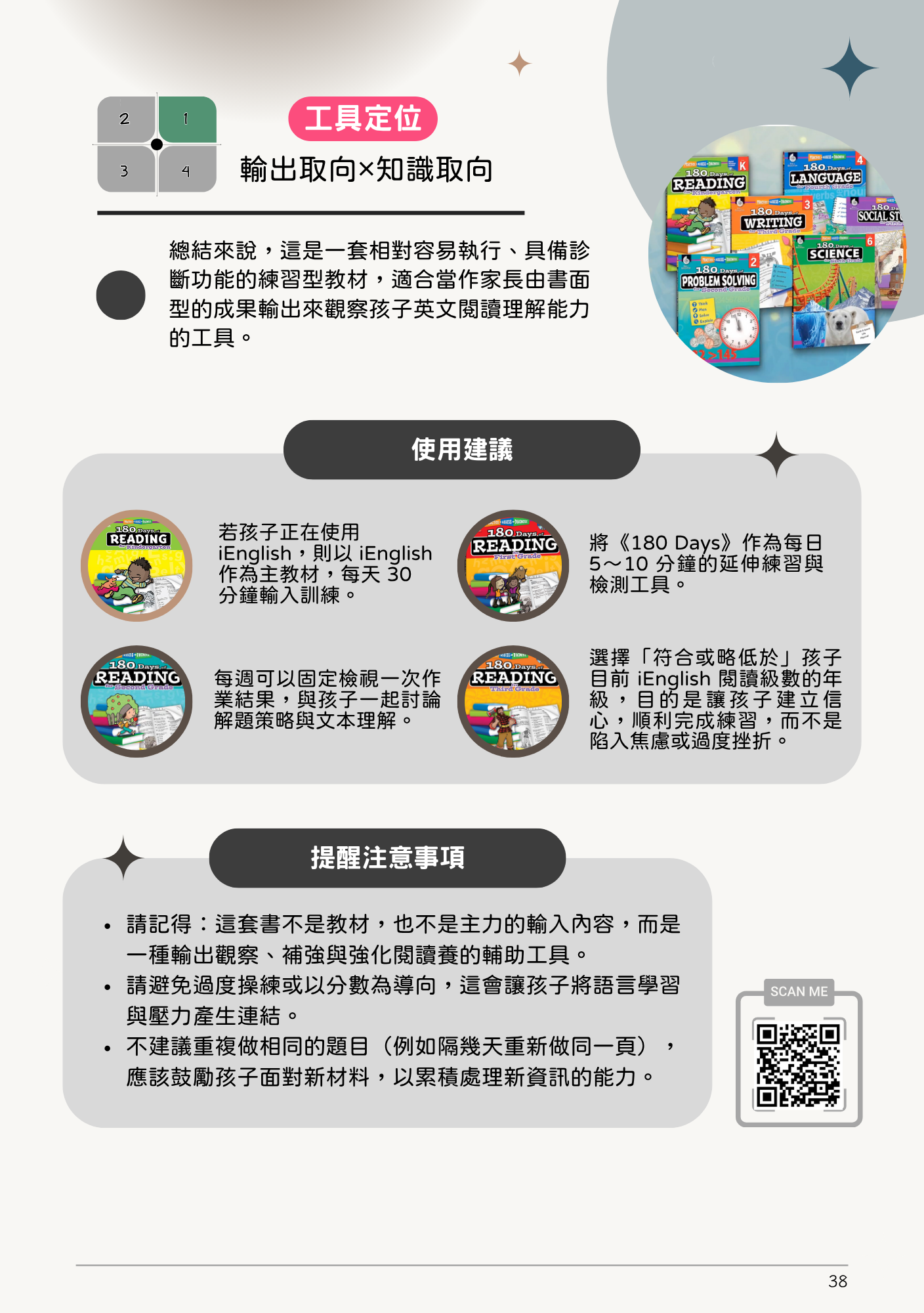當你採用iEnlish進行大量泛讀進行「廣耕」輸入時,也別忘記「深耕」扎實孩子的個別英文能力,包含閱讀理解力、文法、進階詞彙、閱讀技巧、口語閱讀流暢度等,真正做到全面打造孩子的英語軟實力。本【英英閱讀基礎組合】即是為此而準備,並且訴求「羽量」、質重於量的高品質練習原則。