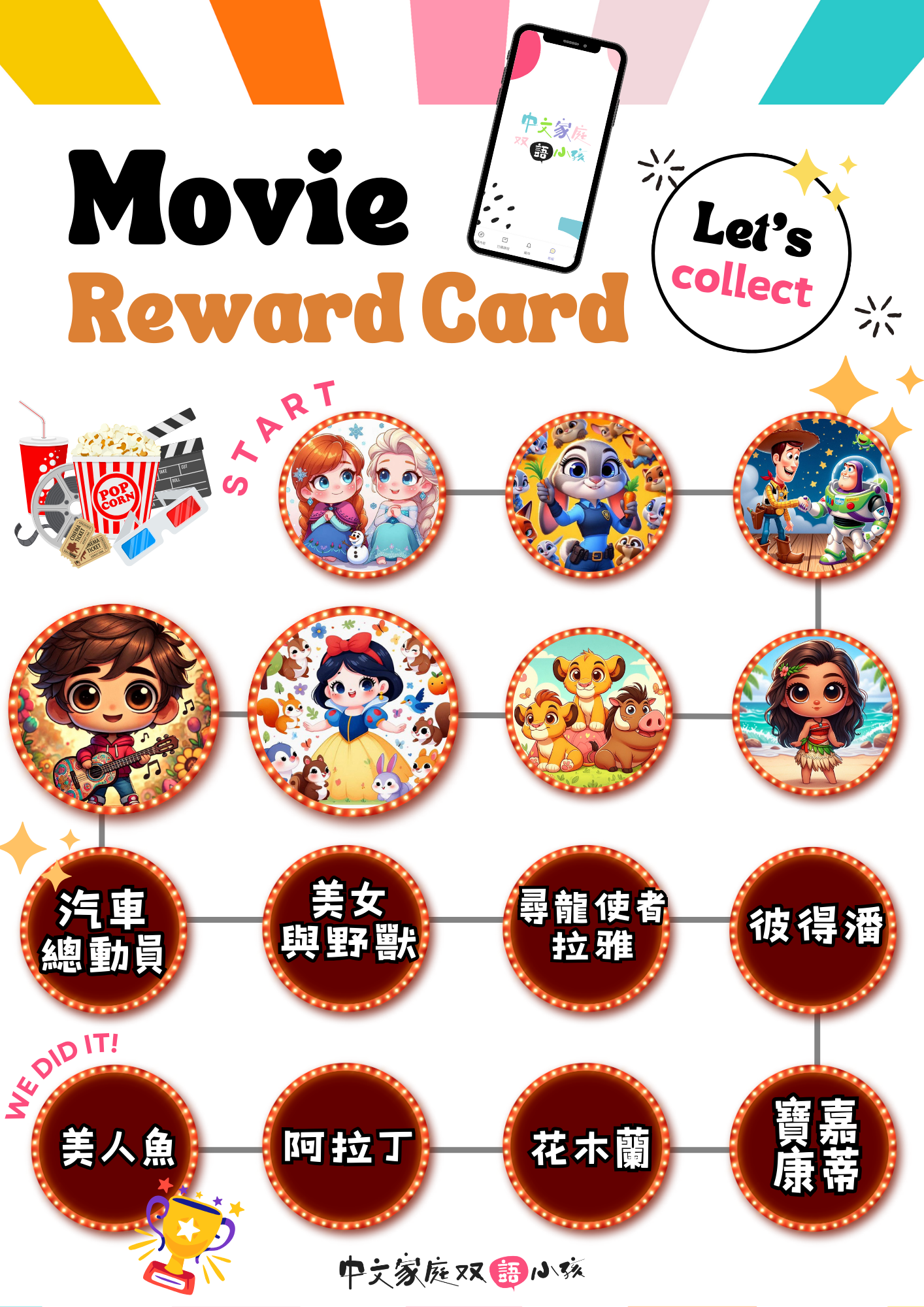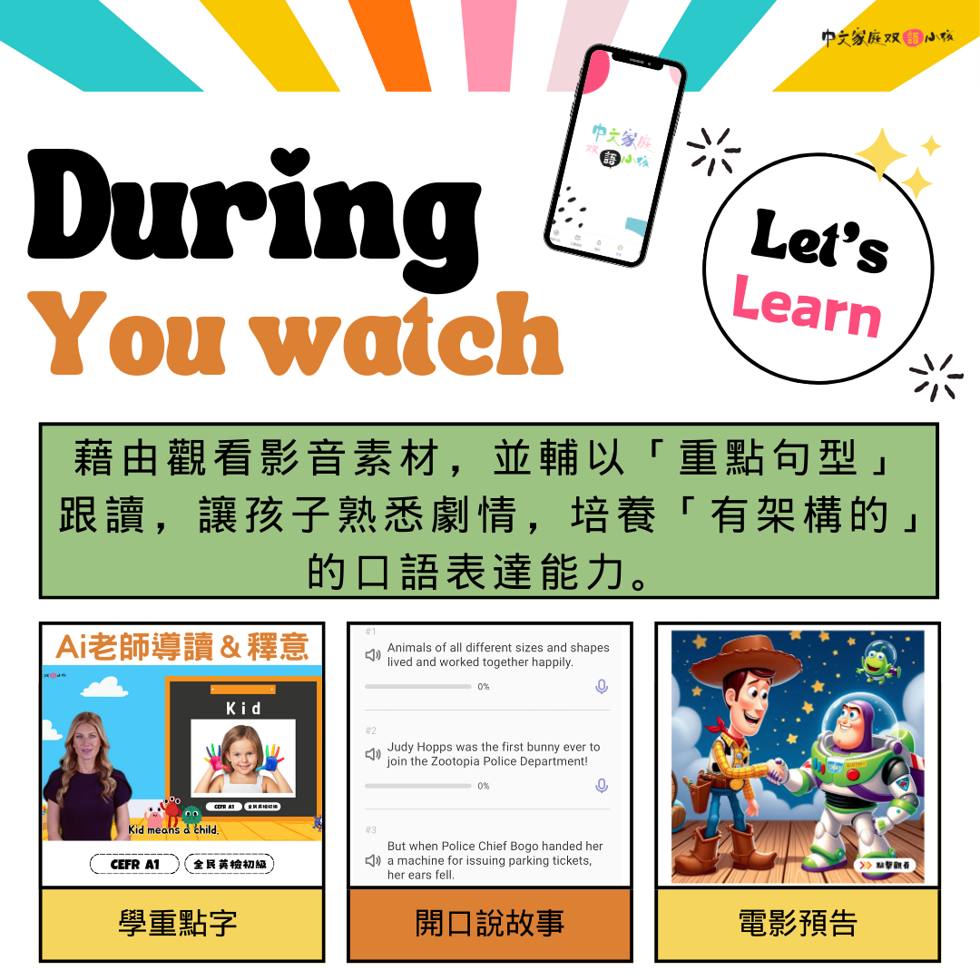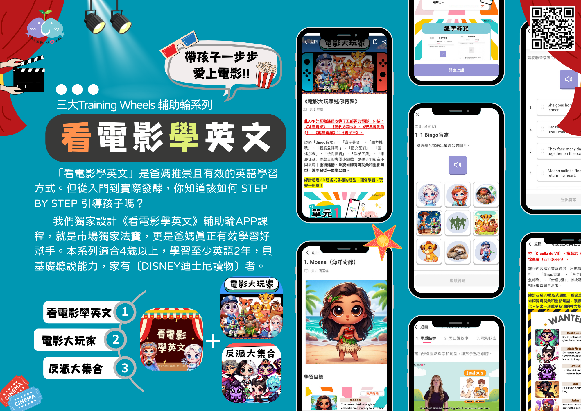 由【中文家庭雙語小孩】app 獨家開發設計的《看電影學英文》輔助輪課程,帶領寶貝在系統循序漸進下,與ARpedia八月新品【 Disney系列】搭配學習,讓看電影學英文發揮 1+1>2 的神奇魔力!