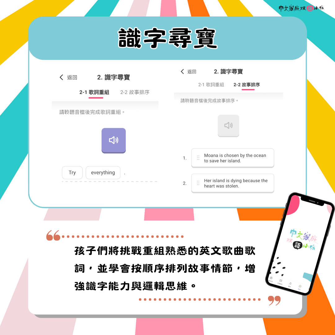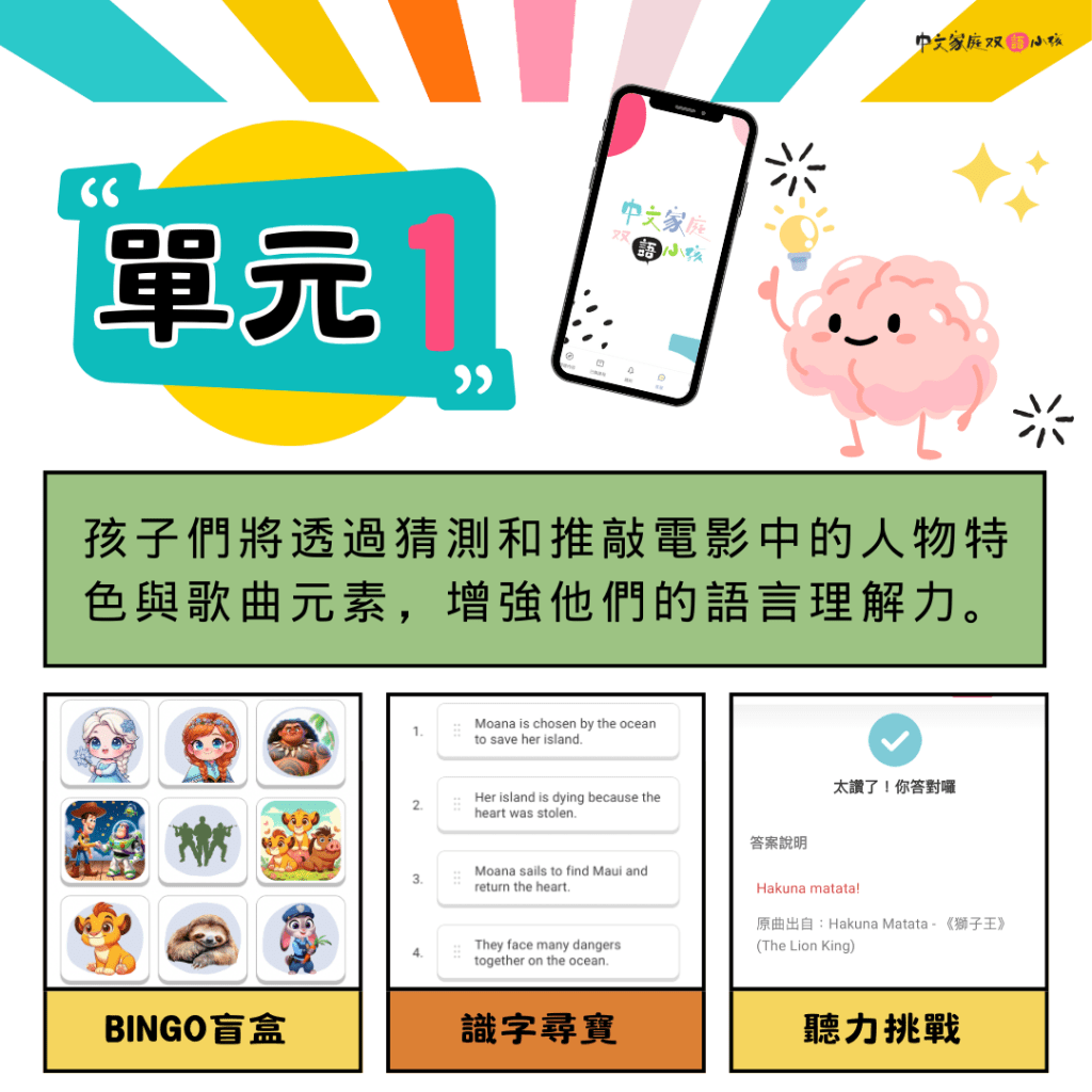 - 《看電影學英文》:精選15部小朋友必看迪士尼經典電影,每一部 Step by Step 提供學習引導內容,讓孩子無痛吸收,依照規劃完成每一部電影暖身後,能更順利銜接正式電影內容(此為建議用法,家長也可依照孩子年紀與喜好,混搭使用)