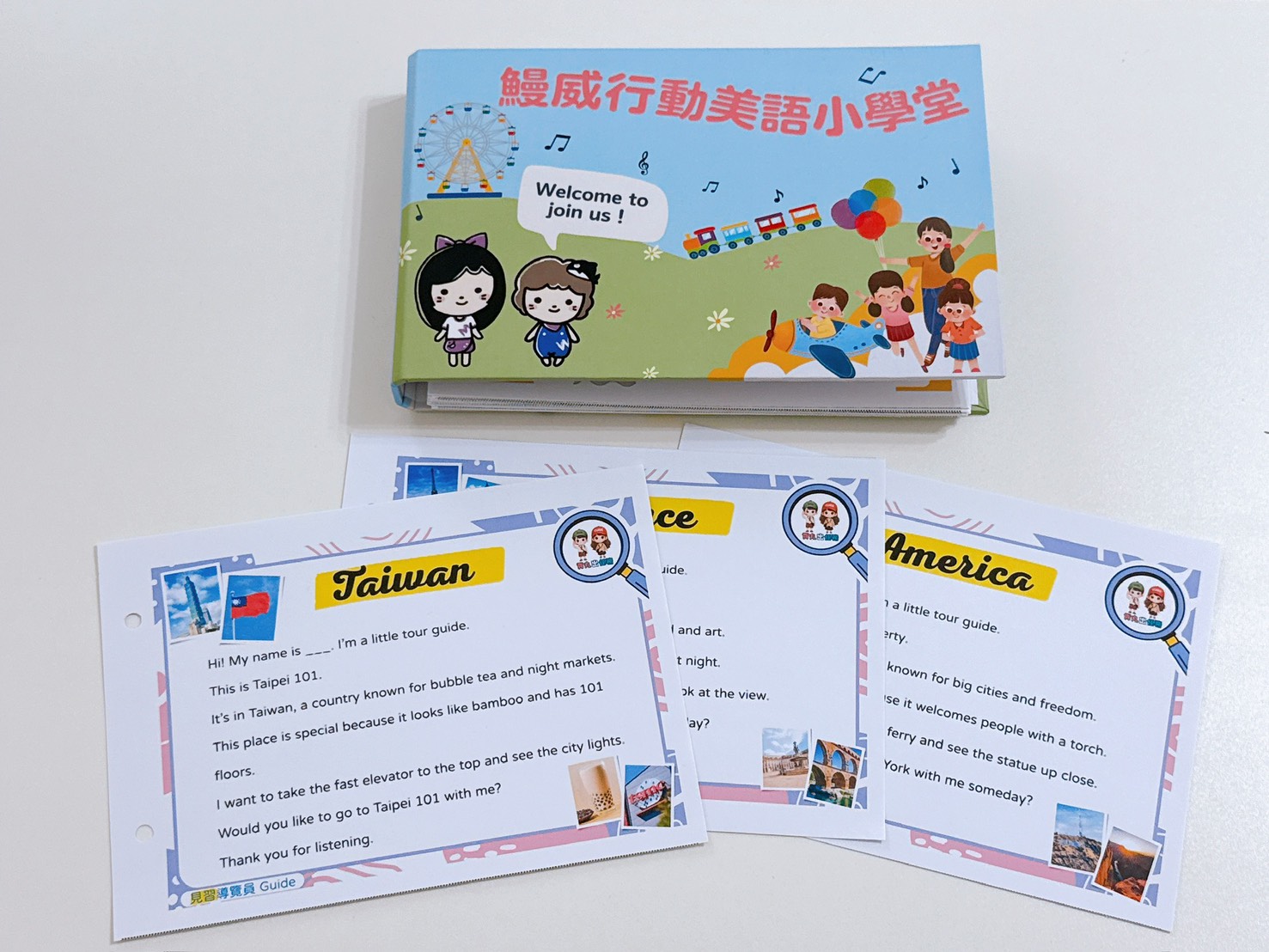 ✅ 10個國家導覽介紹文、導覽員與主播角色卡、領讀語音練習