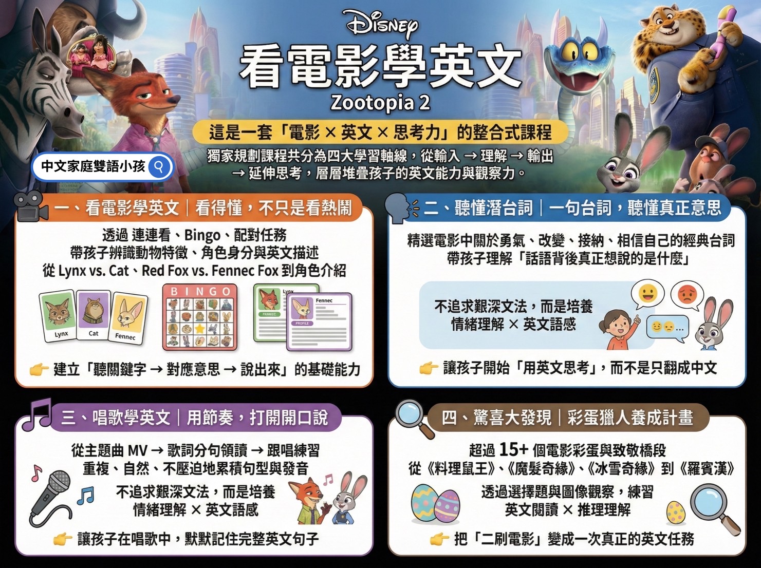 本課程以迪士尼強檔動畫《動物方城市 2》為核心,專為孩子設計了一套結合「聽、說、讀、想」的全方位英語學習旅程。透過電影的沉浸式情境,我們將帶領孩子從表面的劇情,深入到語言的細節與文化的趣味。
